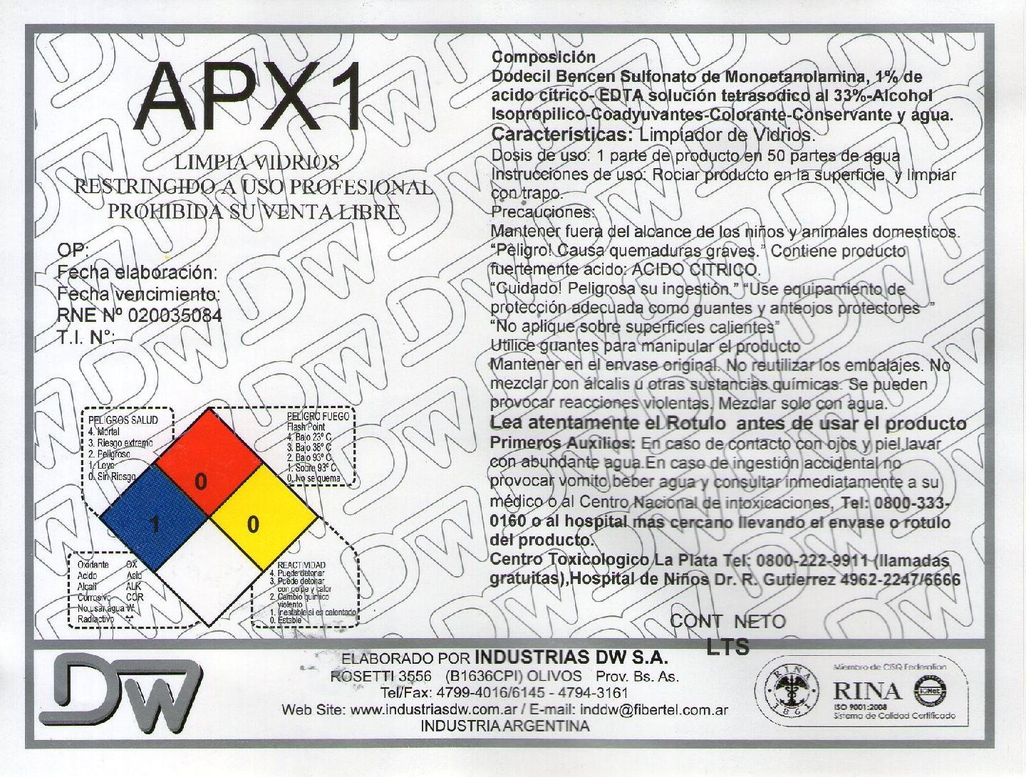 Descripción Producto desarrollado para limpieza de superficies brillantes pulidas y no porosas como ser vidrio, porcelanato, aceros, etc. No deja Vetas Acepta dilución en agua. Ficha técnica Hoja de Seguridad Apx1 Limpiador de Vidrios Ver ficha técnica Descargar ficha técnica